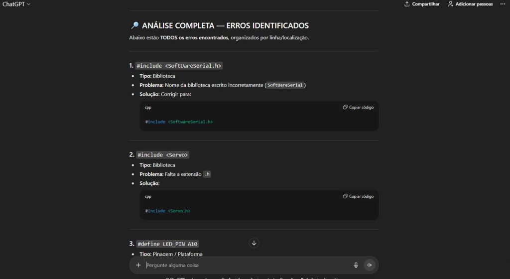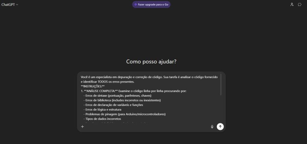 O prompt abaixo foi criado para uso geral e funciona muito bem para Arduino, C++, Python e outras linguagens. Caso você precise de algo mais específico, é totalmente possível adaptá-lo à sua necessidade.