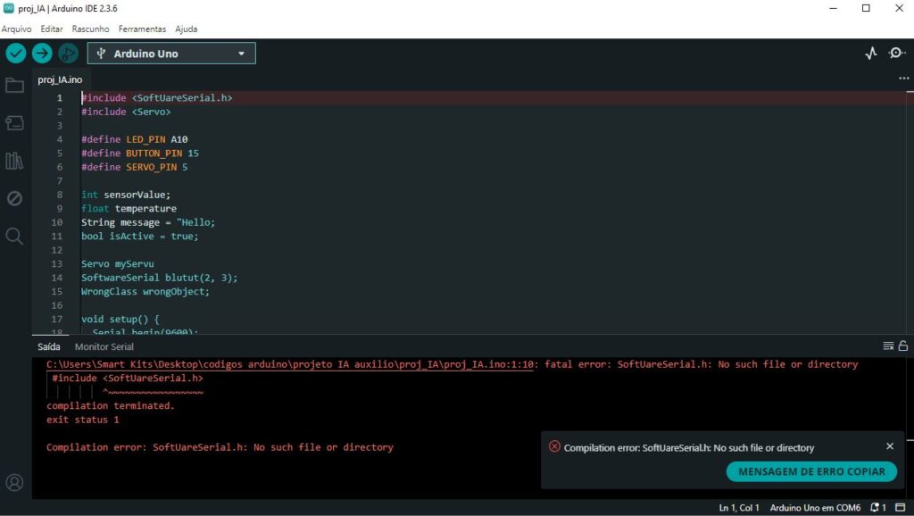 Neste conteúdo, vamos usar como exemplo um código visivelmente errado, semelhante ao que mostramos no vídeo publicado no instagram da Smart Kits. Ele possui: